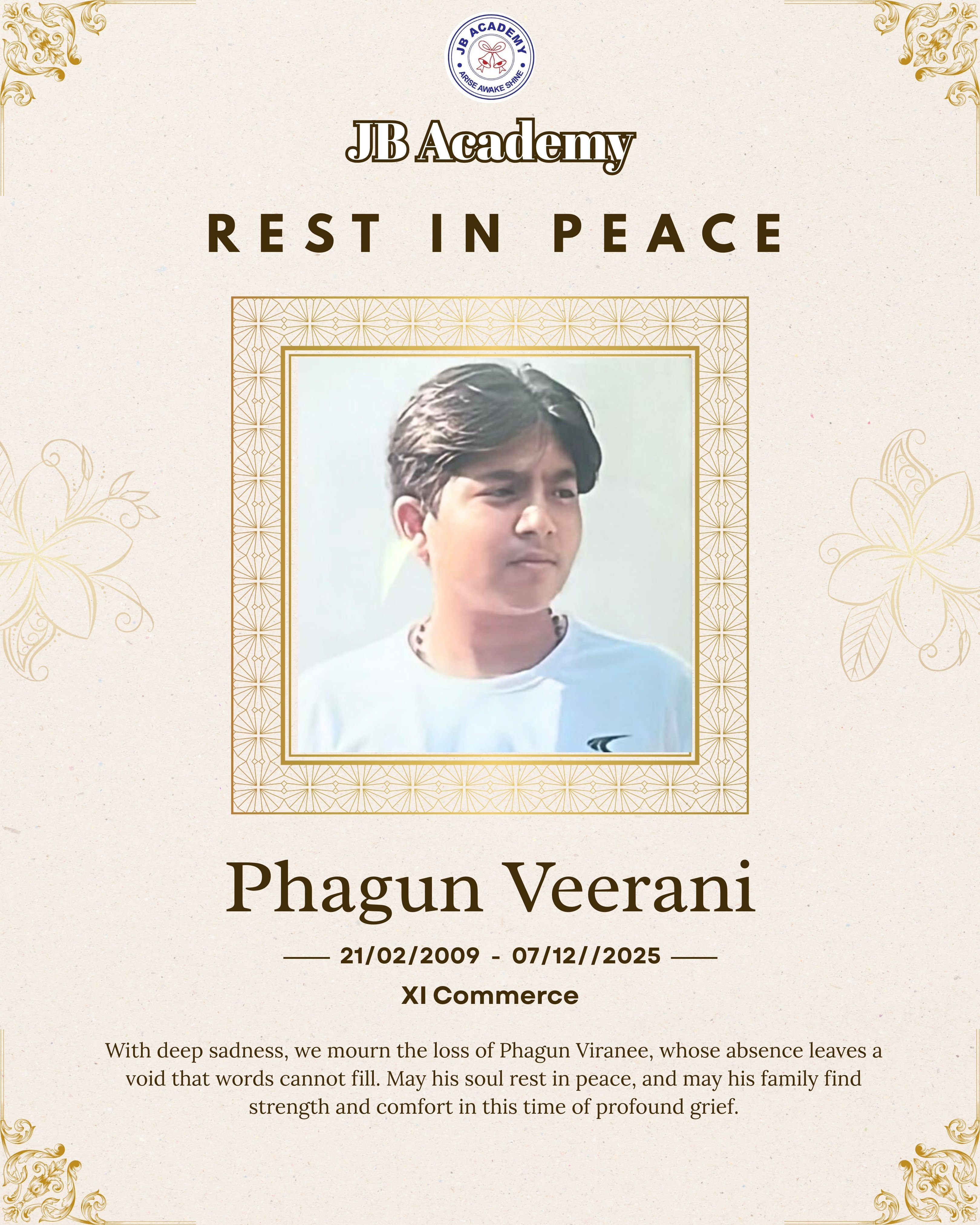 With profound sorrow, we share the heartbreaking news of the passing of Phagun Viranee of Class XI Commerce, whose life was cut tragically short. His presence, warmth, and the light he brought to those around him will forever remain in our memories. May his soul find eternal peace, and may his family and loved ones find the courage and strength to endure this unimaginable loss. His absence leaves a silence that words cannot fill, but his spirit will continue to live on in the hearts of all who knew him.