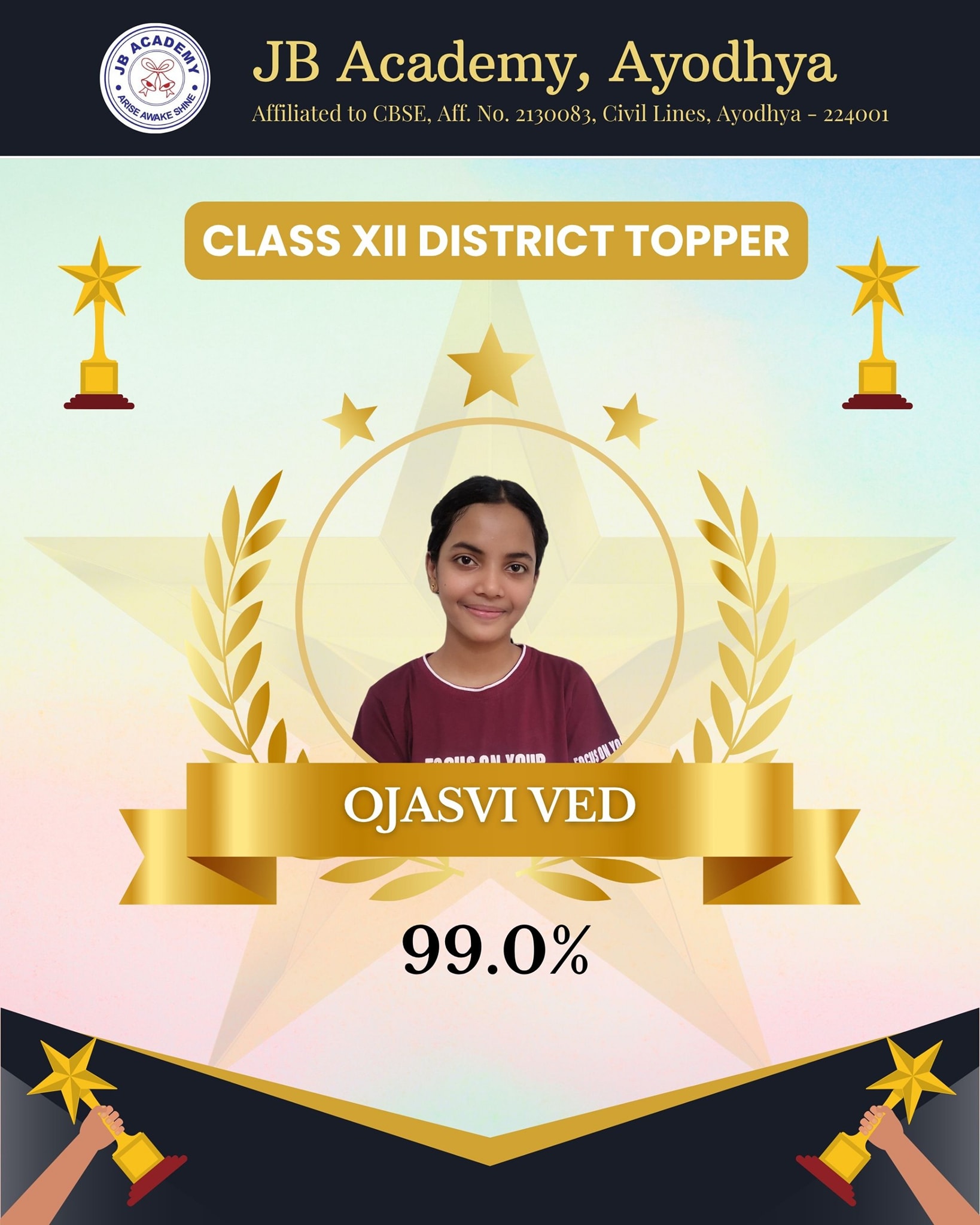 We are proud to announce that Ojasvi Ved has secured the 1st position in the district in the CBSE Class XII Board Examinations with an outstanding 99.0% in the Commerce stream, bringing immense pride to the school. Along with her, our brilliant achievers – Kadambari Rajpal (98.8%, Science), Zoha Fatima (98.8%, Humanities), Avika Sharma (97.4%, Humanities), Swastik Sharma (97.2%, Science), Vaishnavi (97.2%, Humanities), and Netritva Singh Rajpoot (97.0%, Science) – have also excelled, setting a shining example of hard work and dedication. Congratulations to all the toppers, their families, and teachers for this remarkable success.