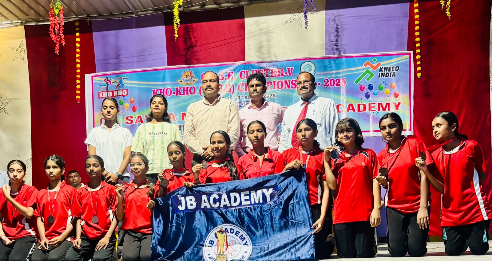CBSE Cluster V Girls Kho-Kho Championship 2025 held from 5th to 8th August at Dr. Savita Memorial Global School, Chunar, JB Academy Girls’ Kho-Kho team delivered a thrilling semi-final performance against Navjeevan English Academy, Ballia, narrowly missing the finals by just one point (5–6). The team secured the 2nd Runner-up position 🏅, winning medals and a trophy, and showcasing remarkable skill, determination, and team spirit.