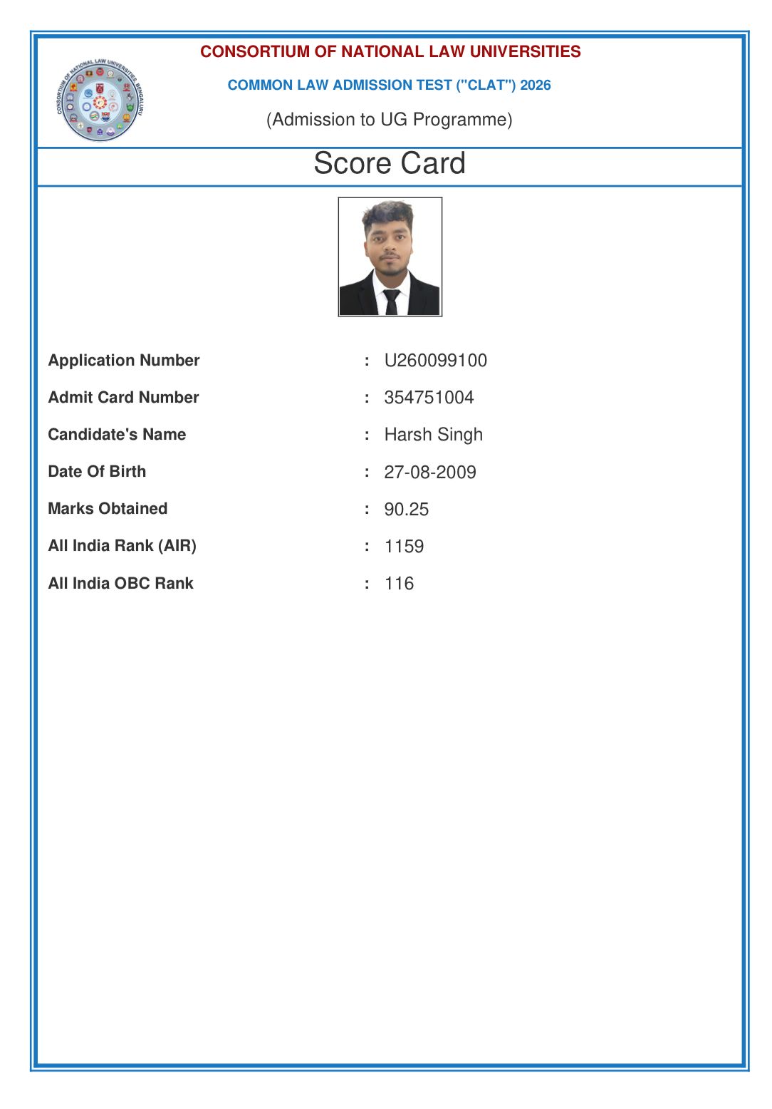 Harsh Singh of Class XII-E, JB Academy has made the school proud by securing an All India Rank 1159 and All India OBC Rank 116 in CLAT 2026. With this remarkable achievement, he is likely to gain admission to prestigious Tier-1 National Law Universities such as NLSIU, Bengaluru or NALSAR, Hyderabad.
